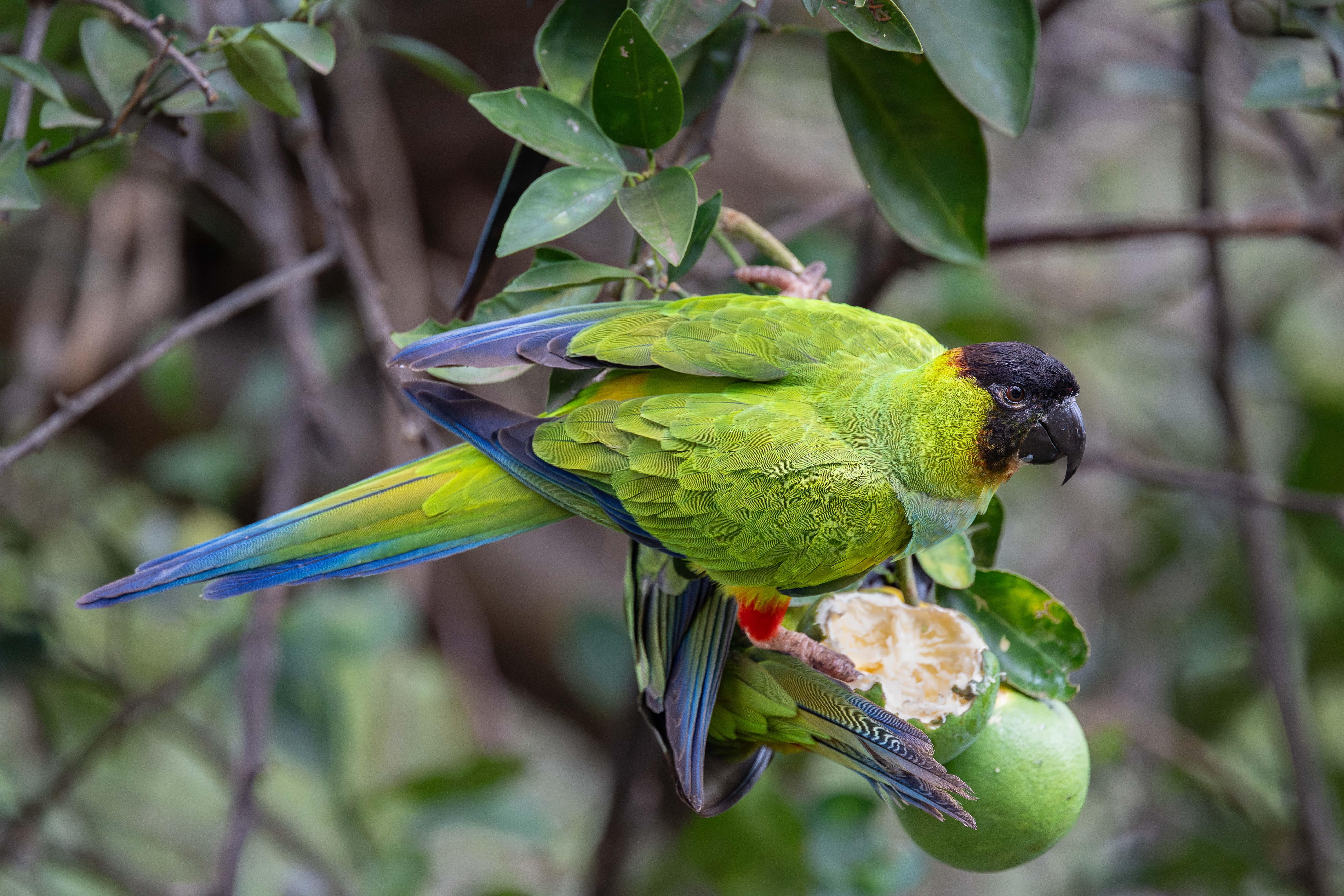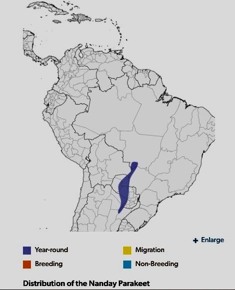 Found in forests and palm stands from southeastern Bolivia and southwestern Brazil to Northern Argentina, the Nanday Parakeet has a diet specializing in palm nuts, though they will eat other nuts, seeds, and fruits.